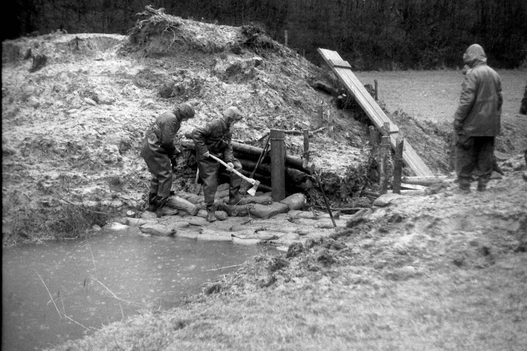 Sie mussten erst vom Technischen Hilfswerk befreit werden, ehe sie mit der Arbeit beginnen konnten. Sie dämmten in unmittelbarer Nähe eines Waldstücks etwa einen Kilometer oberhalb der Kiesgrube einen Wasserlauf ein.